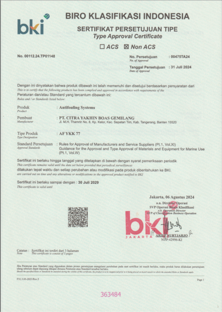 Yokatta Paint berdedikasi untuk menjaga standar kualitas dan keamanan tertinggi. Produk kami telah disertifikasi oleh Biro Klasifikasi Indonesia, dan kami mematuhi standar industri yang ketat, termasuk ISO 9001 : 2015.
